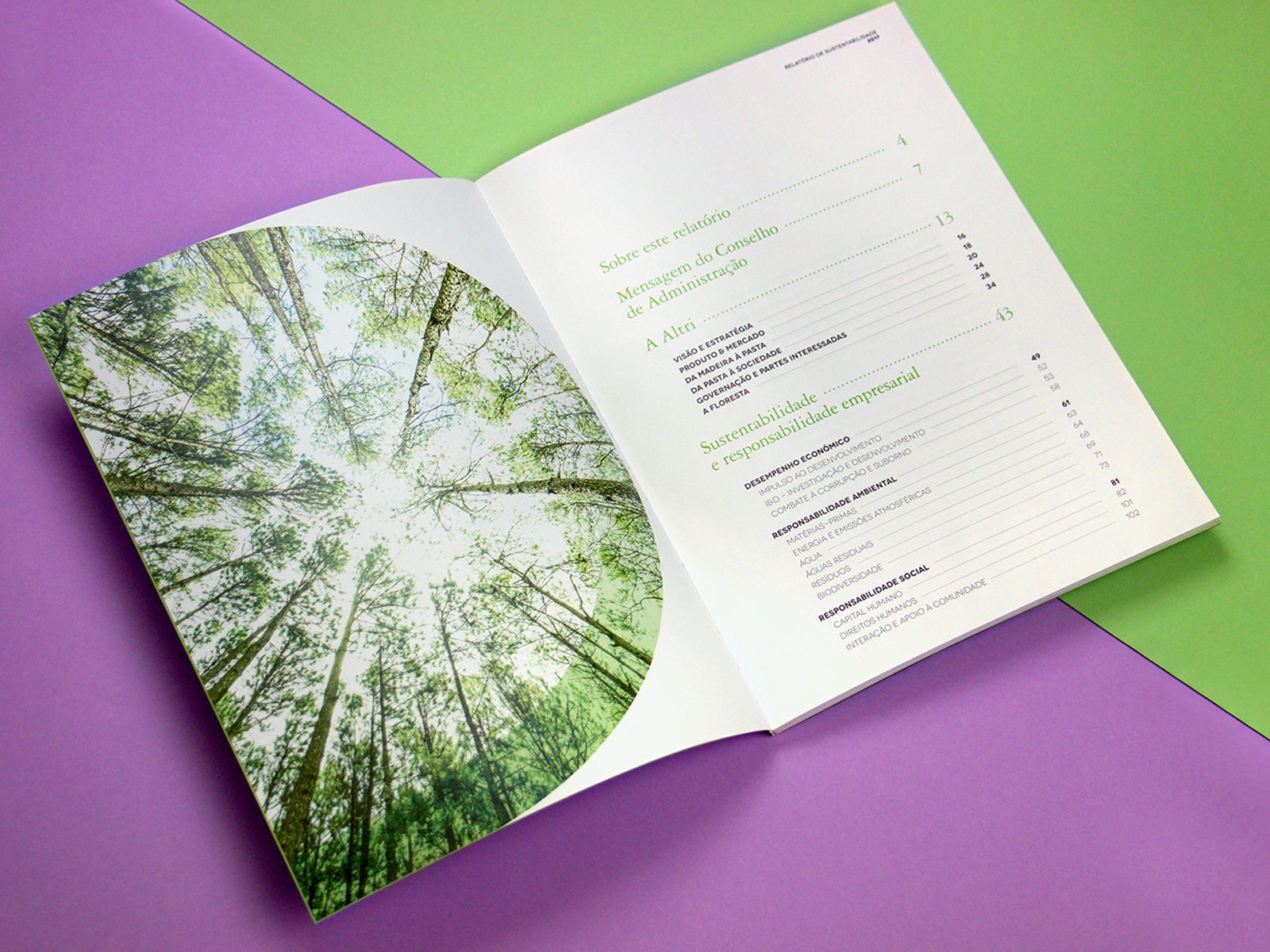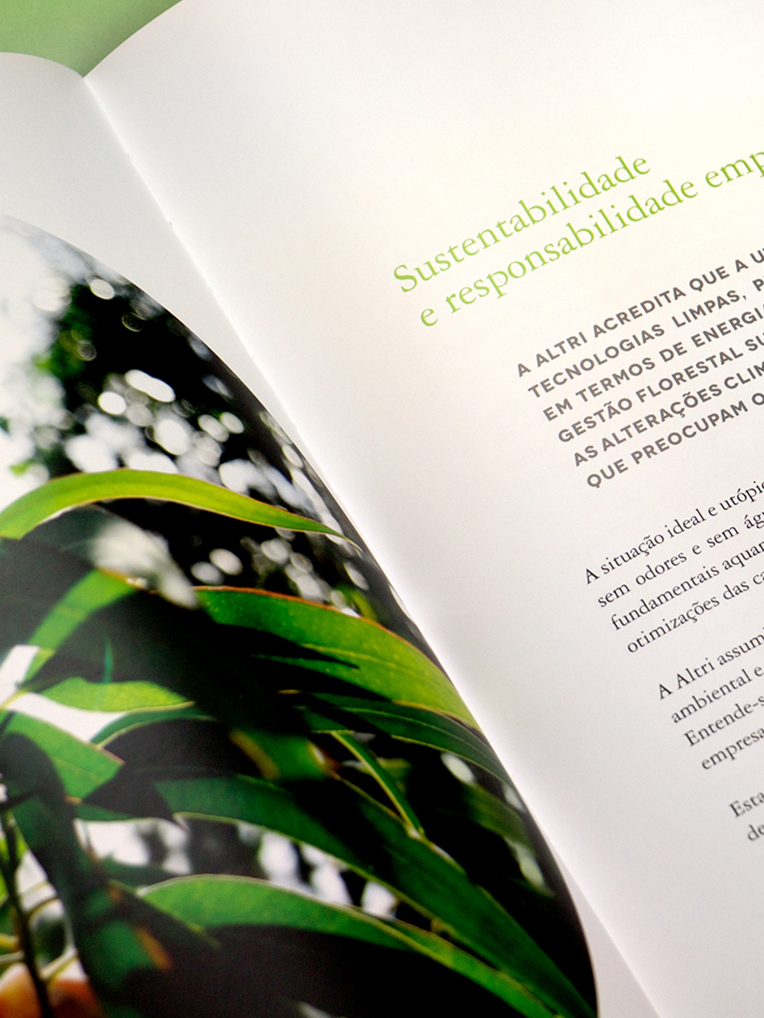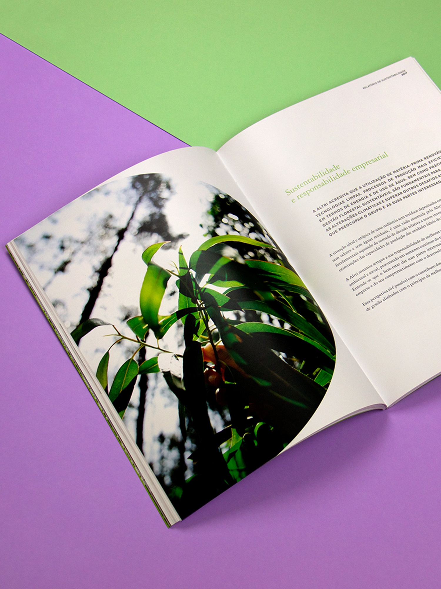 Projeto de design editorial para o relatório anual de sustentabilidade da Altri.