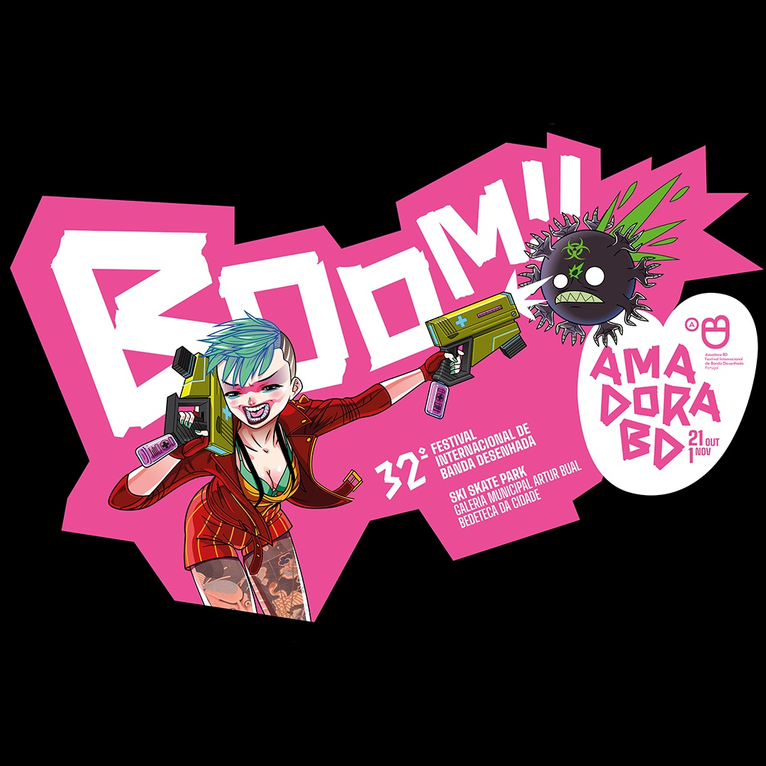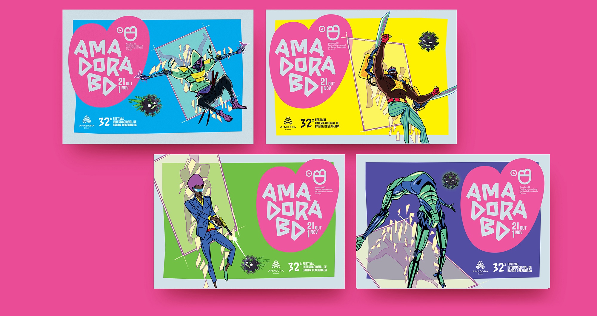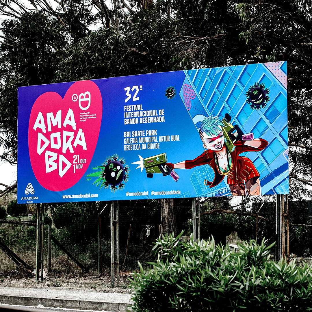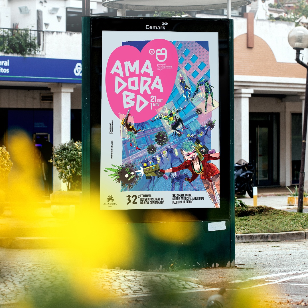 Da necessidade de dar uma nova dimensão ao logotipo Amadora BD, criámos uma forma que surgiu da união entre AMA e BD.Tendo como tema base, Amadora cidade, futuro e Mangá, criámos um contraste entre a narrativa da ilustração e o logo em forma de coração, e entre tons rosa e azuis. A 32ª edição do festival celebra os 80 anos da Mulher maravilha e em paralelo temos pela primeira vez temos uma personagem feminino em destaque. A ilustração do festival transporta-nos para o Mangá, um género com acentuada presença nesta edição do festival. Transmite também um género street like, com muito movimento e ação. O lettering desenvolvido, as formas facetadas e as onomatopeias transportam-nos para este mundo.