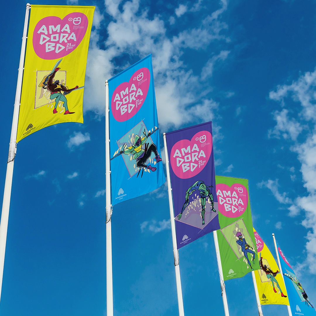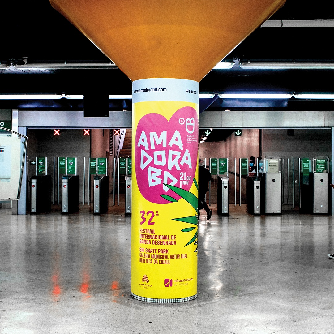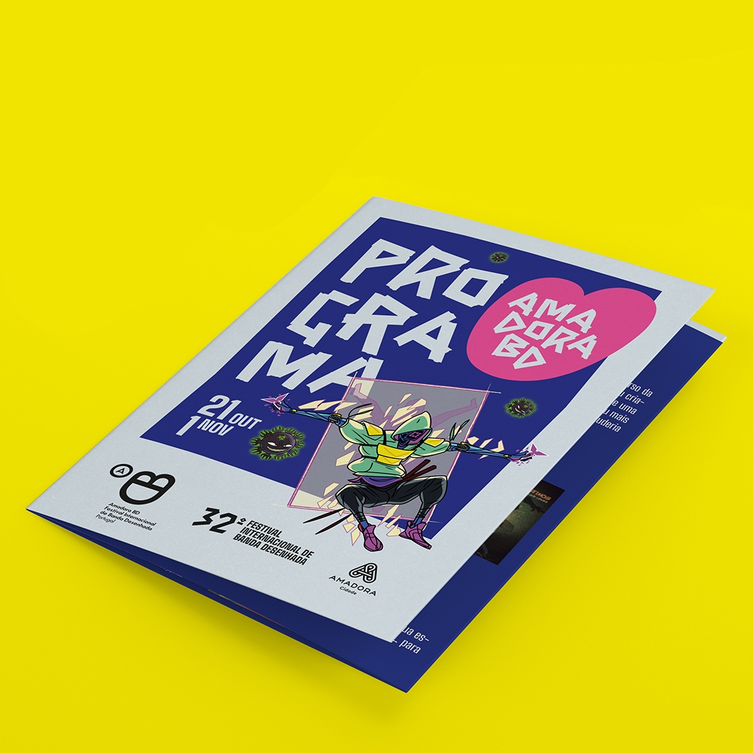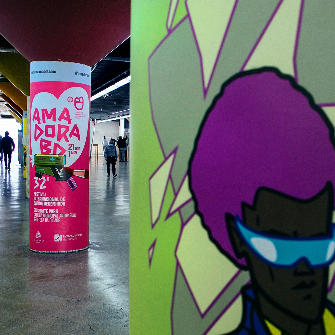 Da necessidade de dar uma nova dimensão ao logotipo Amadora BD, criámos uma forma que surgiu da união entre AMA e BD.Tendo como tema base, Amadora cidade, futuro e Mangá, criámos um contraste entre a narrativa da ilustração e o logo em forma de coração, e entre tons rosa e azuis. A 32ª edição do festival celebra os 80 anos da Mulher maravilha e em paralelo temos pela primeira vez temos uma personagem feminino em destaque. A ilustração do festival transporta-nos para o Mangá, um género com acentuada presença nesta edição do festival. Transmite também um género street like, com muito movimento e ação. O lettering desenvolvido, as formas facetadas e as onomatopeias transportam-nos para este mundo.