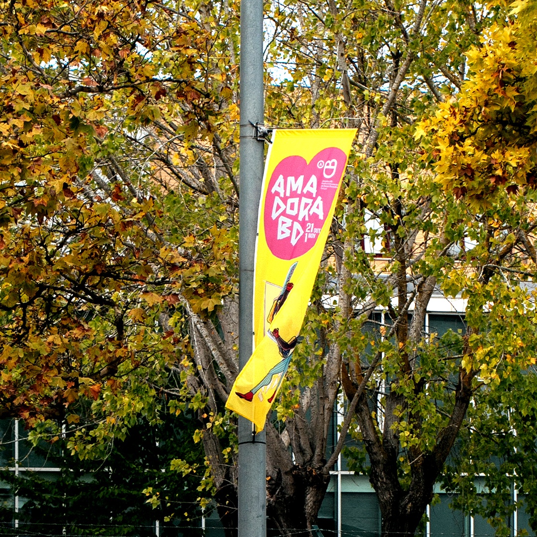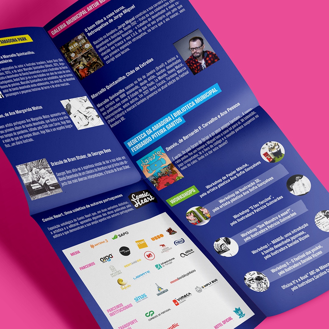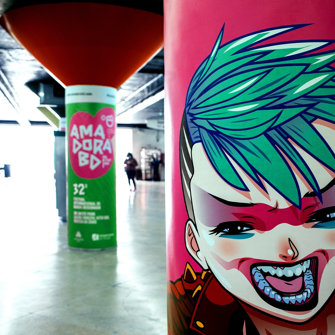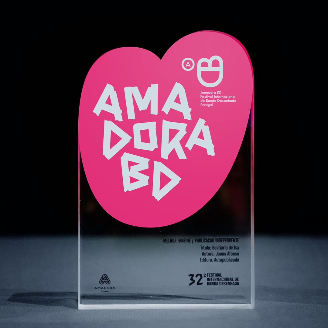 Da necessidade de dar uma nova dimensão ao logotipo Amadora BD, criámos uma forma que surgiu da união entre AMA e BD.Tendo como tema base, Amadora cidade, futuro e Mangá, criámos um contraste entre a narrativa da ilustração e o logo em forma de coração, e entre tons rosa e azuis. A 32ª edição do festival celebra os 80 anos da Mulher maravilha e em paralelo temos pela primeira vez temos uma personagem feminino em destaque. A ilustração do festival transporta-nos para o Mangá, um género com acentuada presença nesta edição do festival. Transmite também um género street like, com muito movimento e ação. O lettering desenvolvido, as formas facetadas e as onomatopeias transportam-nos para este mundo.