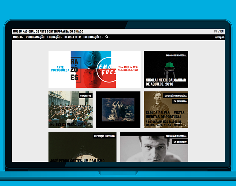 Identidade e comunicação da exposição “Razões e Emoções” para o Museu Nacional de Arte Contemporânea - Museu do Chiado, em Lisboa. Esta exposição viaja por 160 anos de arte portuguesa, através de autores e obras pouco mostradas, focando razões e emoções artísticas e explorando continuidades e mudanças, emoções e conceitos. Associámos razões e emoções a reta e curva e a quente e frio, um contraste equilibrado que reflete o conceito da exposição.