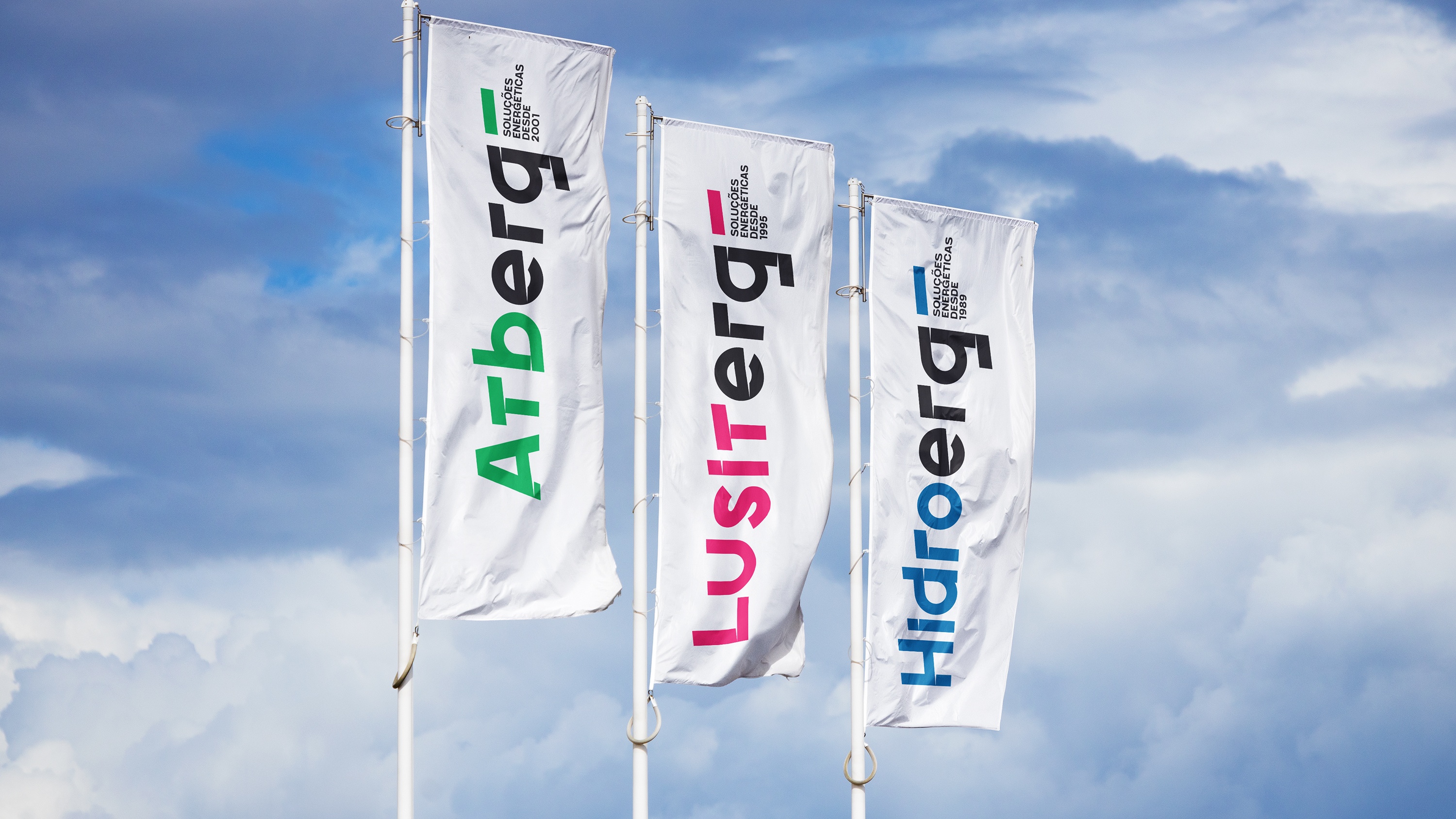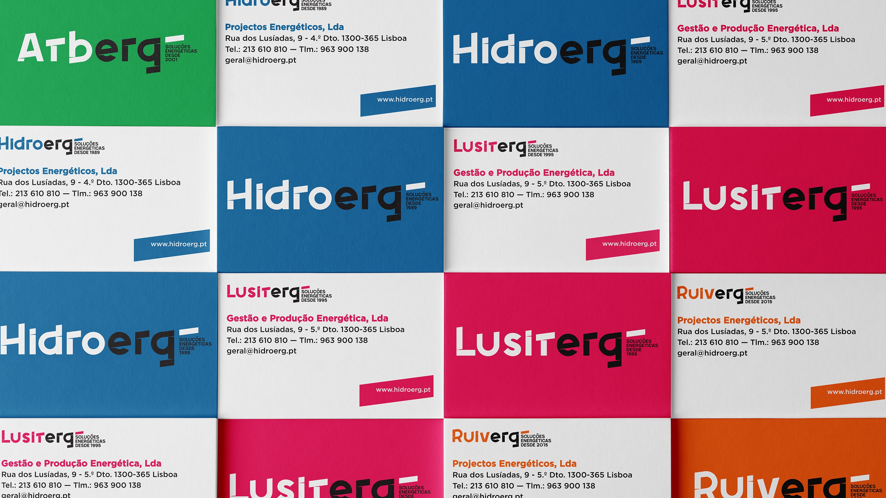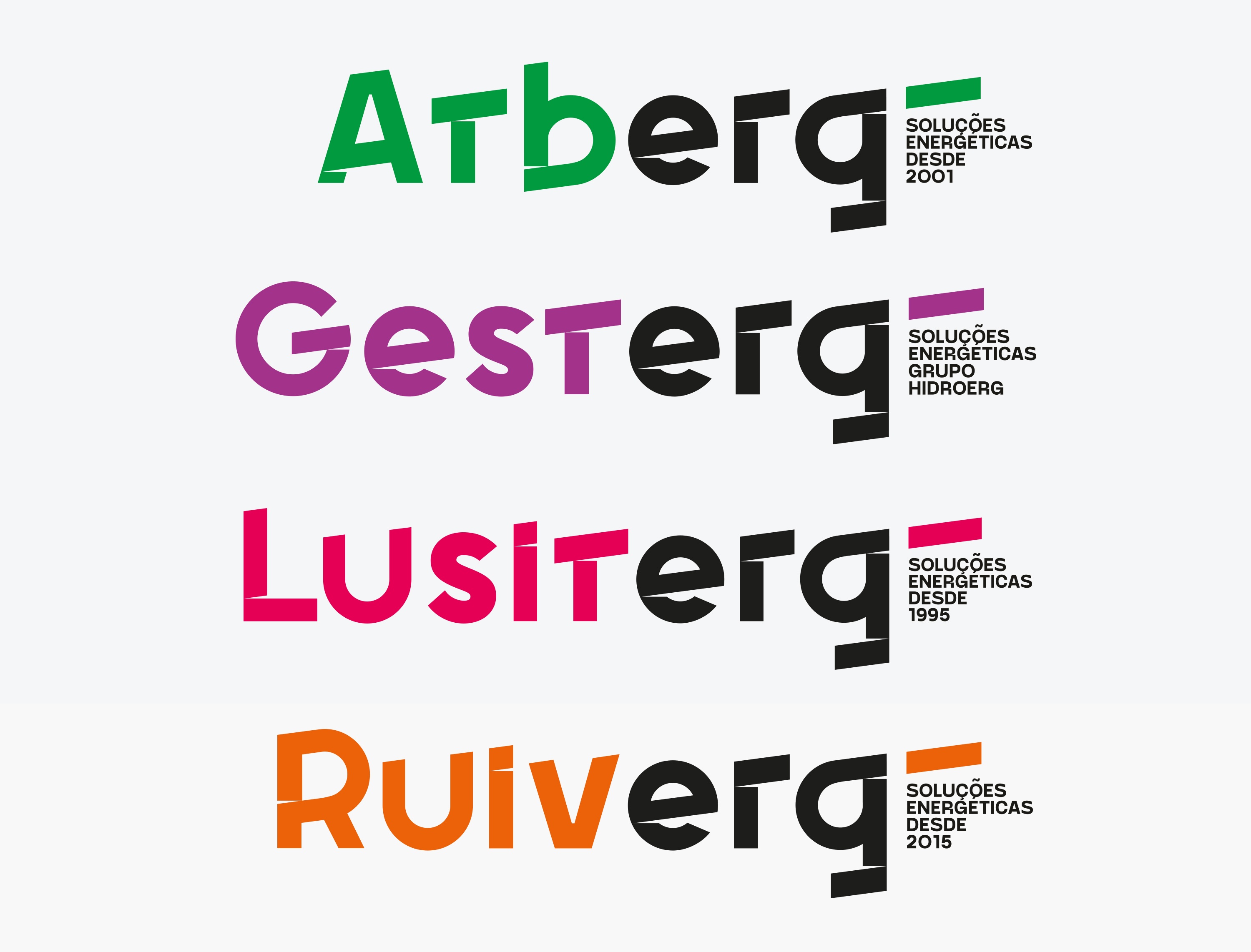 Projeto de branding para a Hidroerg e para as suas empresas irmãs Atberg, Lusiterg e Ruiverg, um grupo de empresas portuguesas de produção e gestão de energia.